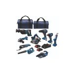 ‎(1) GDX18V-1800 18V EC Brushless 1/4 In. and 1/2 In. Two-In-One Bit Socket Impact Driver (1) GSB18V-490 18V EC Brushless 1/2 In. Hammer Drill/Driver (1) CRS180 18V 1-1/8 In. D-Handle Reciprocating Saw (1) CCS180 18V 6-1/2 In. Circular Saw (1) GOP18V-28 18V StarlockPlus® Oscillating Multi-Tool (1) 1-1/4 In. Plunge Blade (1) GWS18V-8 18V 4-1/2 In. Brushless Angle Grinder with Slide Switch (1) GAS18V-02 18V Handheld Vacuum Cleaner (1) GBL18V-71 18V Blower (1) GLI18V-300 18V Articulating LED Worklight (2) GBA18V40 18V CORE18V Lithium-Ion 4.0 Ah Compact Batteries (1) 18V Charger (2) Belt Clips (2) Carrying Bags